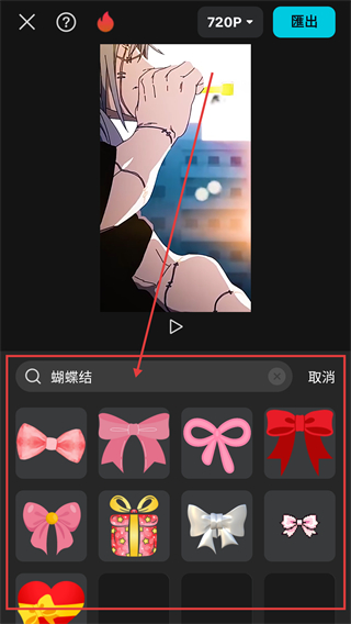 4、在搜索框输入【蝴蝶結】,面板会展示对应风格的贴图,选择喜欢的样式即可添加到视频中啦。