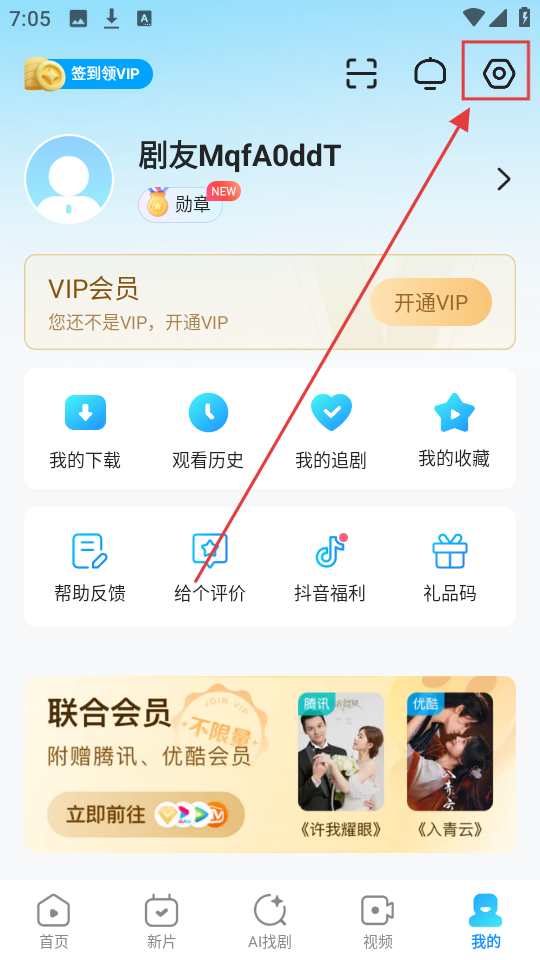 2、在个人中心页面,点击右上角设置图标,进入设置页面,可找到小窗播放相关选项哦。