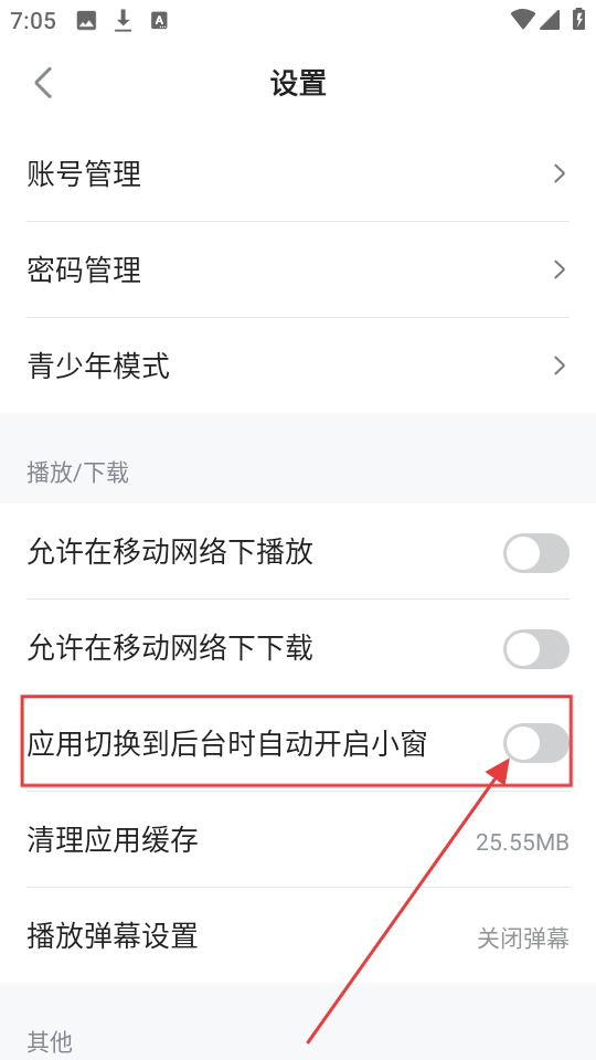 3、在设置页面,找到“应用切换到后台时自动开启小窗”选项,点击其右侧开关,准备开启该功能呢。