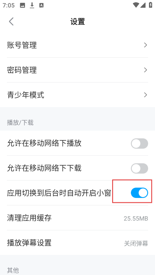 4、开关变为蓝色后,“应用切换到后台时自动开启小窗”功能成功开启,切换后台时视频会自动小窗播放啦。
