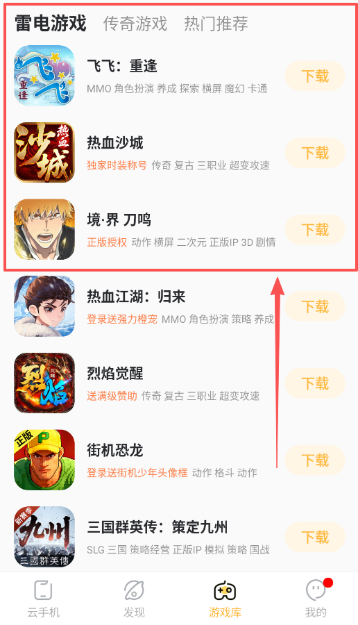 4、在“游戏库”中,你可以批量下载需要的游戏,像热血沙城、境界刀鸣等,下载后游戏会在云手机内自动安装好。