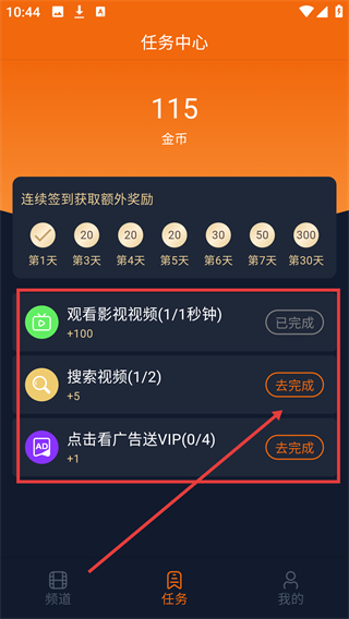 1、点击【任务】,进入任务中心界面,可查看并完成各类任务获取金币哦。