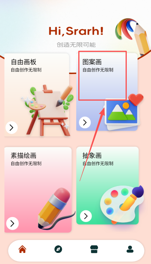 三、返回首页选择创作模式,例如“自由画板”或“图案画”,进入画布后即可自由创作,工具栏和色彩选项都很直观。