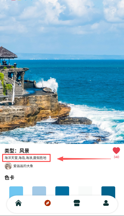 四、如果想画风景类作品,可以在类型中选择“风景”,参考系统提供的主题描述与色卡,比如“海洋天堂”的色彩搭配。