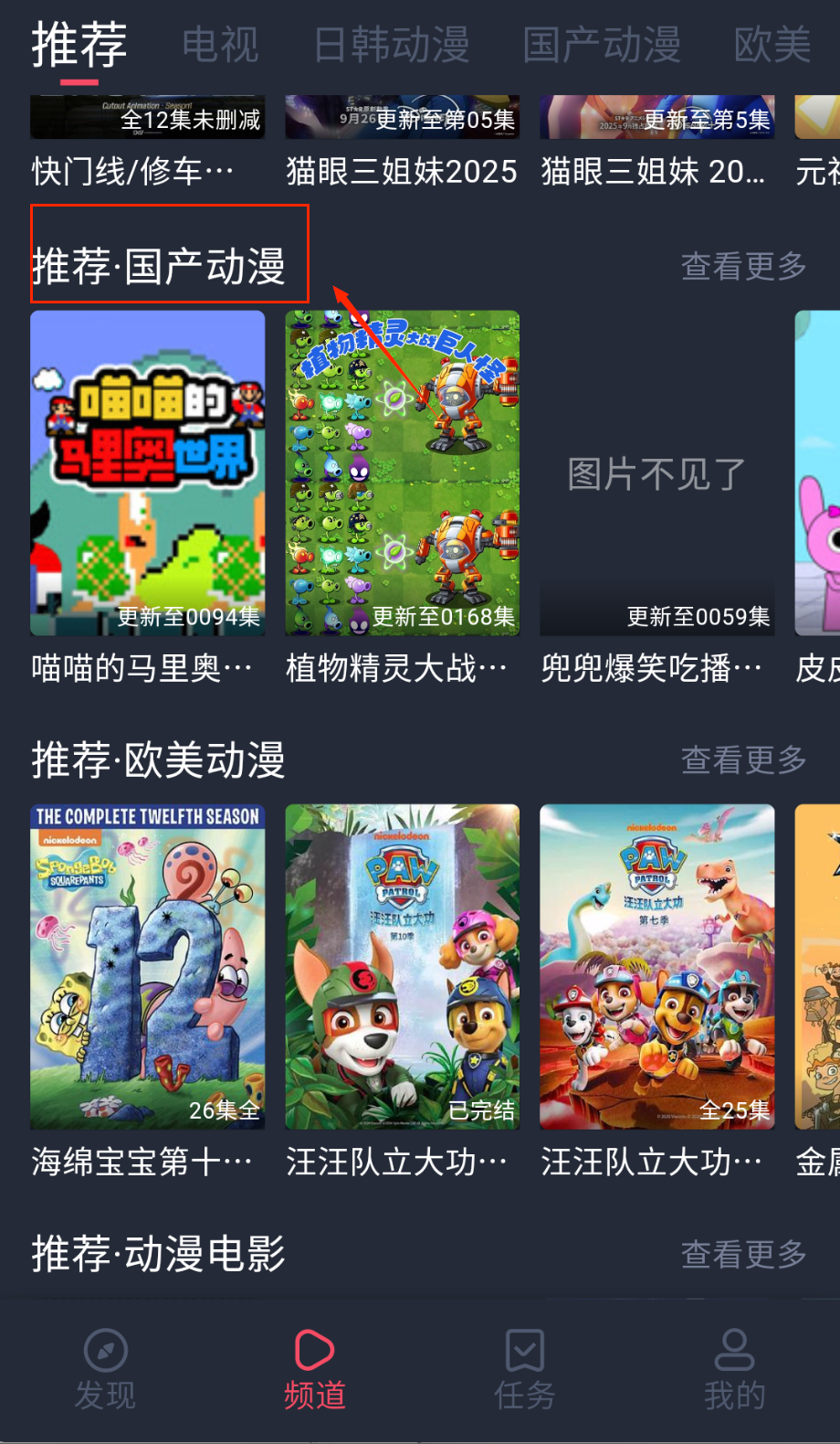 4、探索底部导航的各个功能,发现页获取个性化推荐,频道页按题材筛选,任务页积累奖励,我的页管理观看记录和收藏列表。