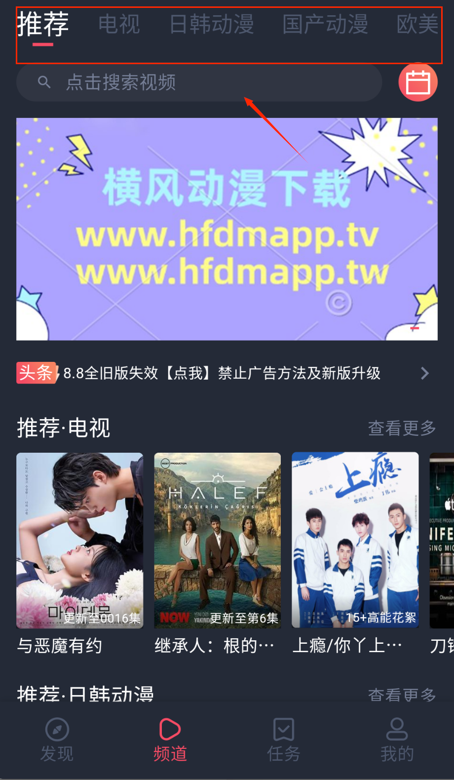 1、打开软件后先浏览顶部导航栏,这里有推荐、电视、日韩动漫、国产动漫、欧美等分类标签,点击任意标签即可进入相应分区。