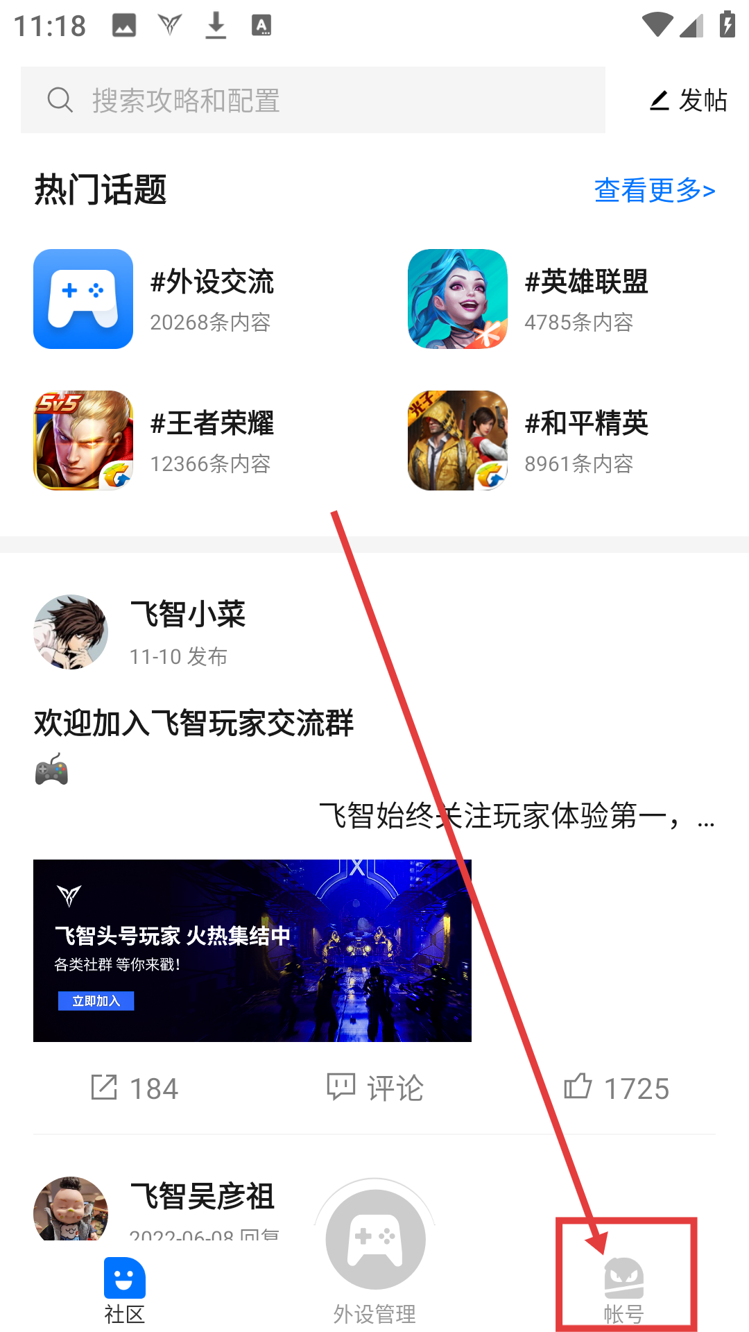 1、在社区页面,点击底部【帐号】,可进入帐号页面,准备进行高级设置操作啦。