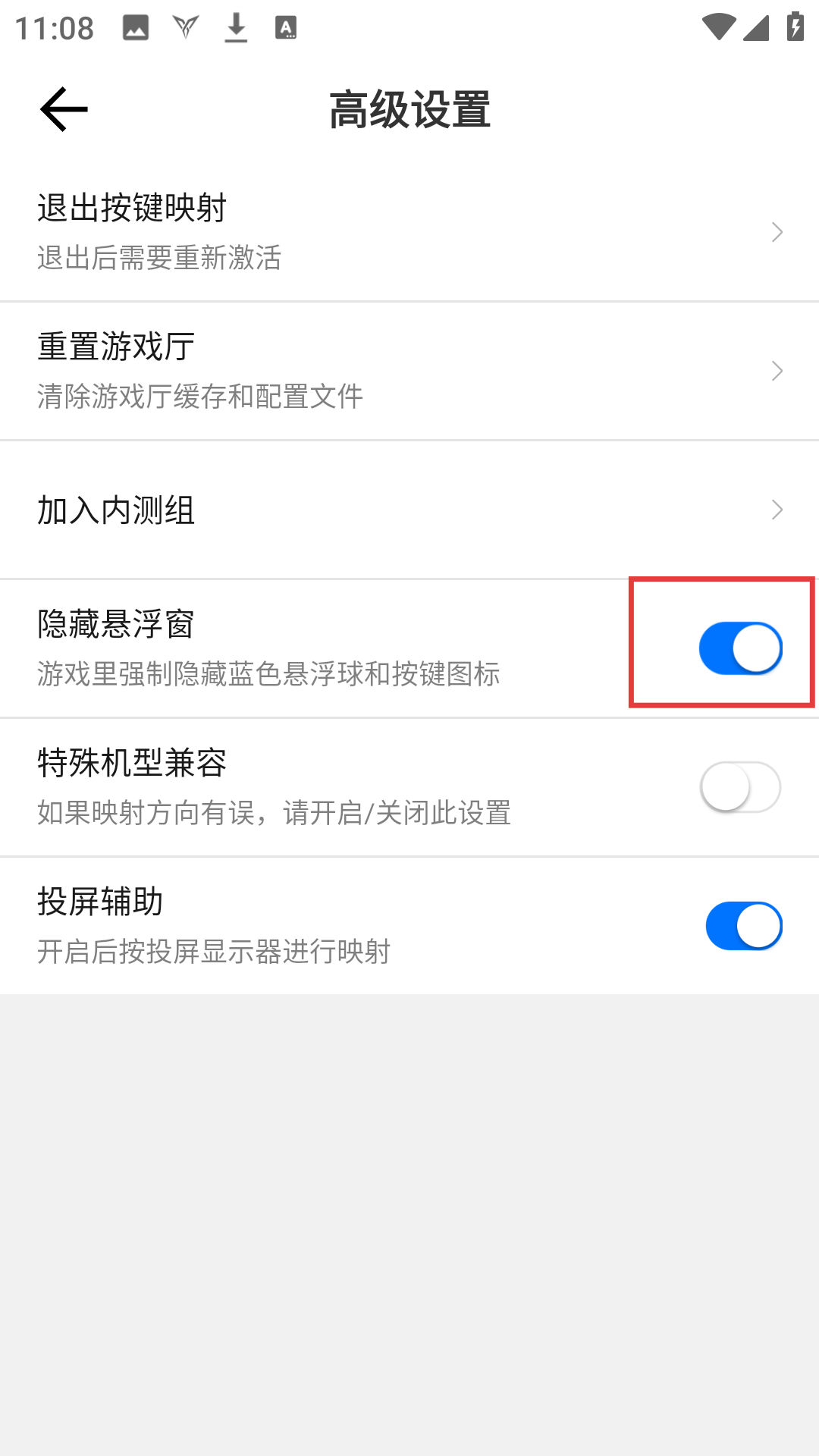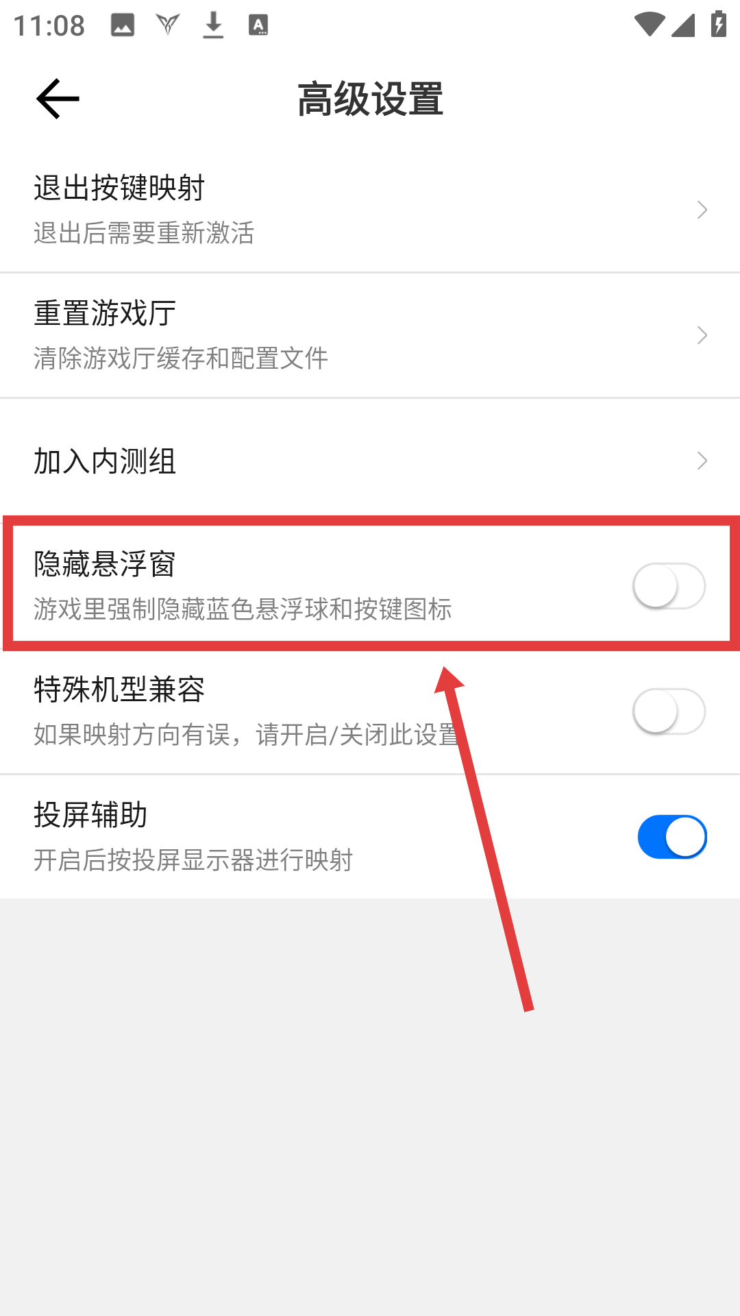 3、在高级设置界面找到【隐藏悬浮窗】,准备开启该功能,优化游戏界面哦。