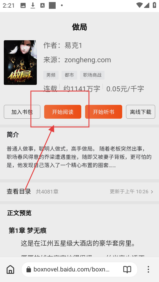 1、点击【开始阅读】,进入小说阅读界面,开启阅读之旅哦。