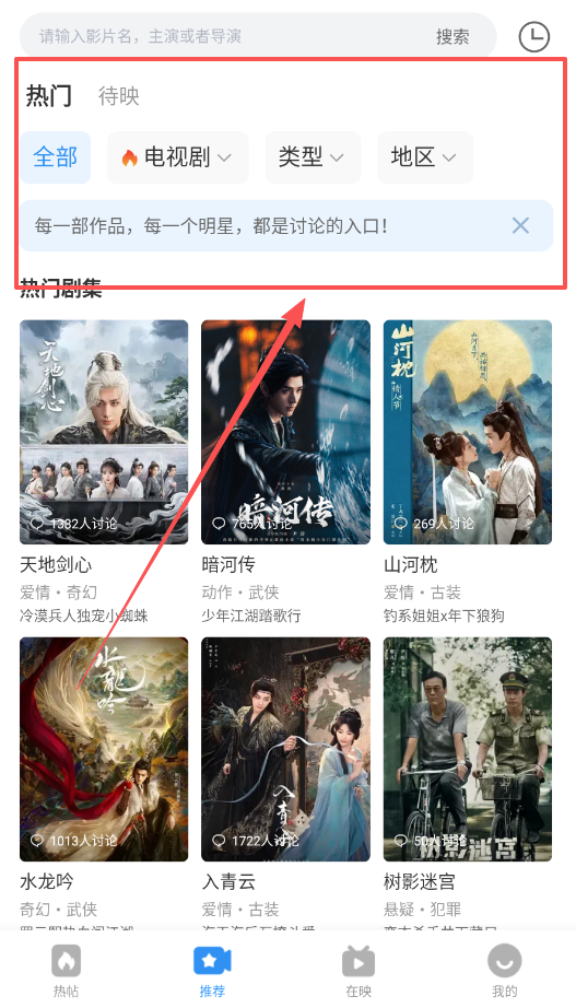 3、找剧的时候可以试试搜索框,或者用“热门”和“待映”标签筛选。下面的“热门剧集”格子展示了不同风格的海报和简介。