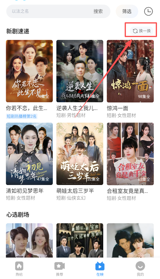 4、喜欢看短剧的话,可以多关注“短剧热播榜”,榜单上的剧集通常都很精彩,点一下“换一换”就能刷新一批新推荐。