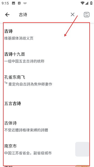 1、在应用的搜索结果页,选择【古诗十九首】条目,即可进入该内容的详情页面啦。