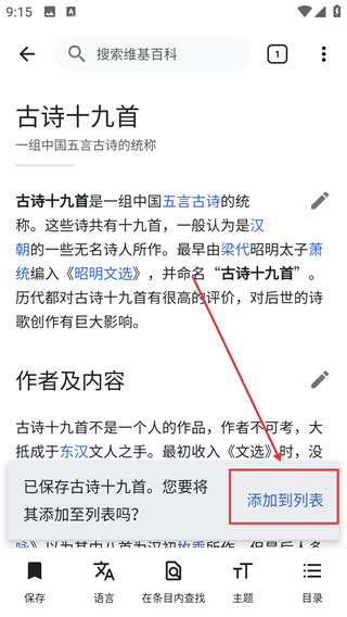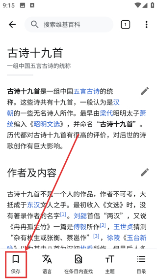 2、进入【古诗十九首】详情页后,点击底部的【保存】按钮,就能将这一内容保存下来方便后续查看哦。