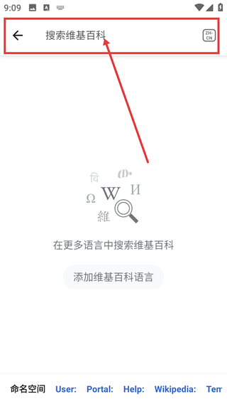 2、进入搜索页后,可直接在搜索框输入内容,还能添加其他语言的维基百科来扩展搜索范围哦。