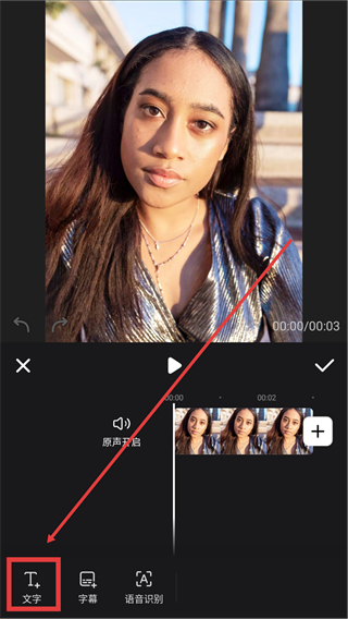 2、选好图片进入编辑页后,点击底部【文字】按钮,就能打开文字编辑的功能面板哦。
