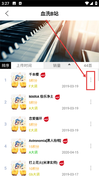 2、进入【血洗B站】曲单页后,找到目标曲目旁的三点按钮并点击,就能打开该曲目的操作菜单哦。