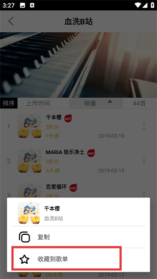 3、在曲目操作菜单里选择【收藏到歌单】选项,就能打开歌单选择界面,准备将曲目加入歌单啦。