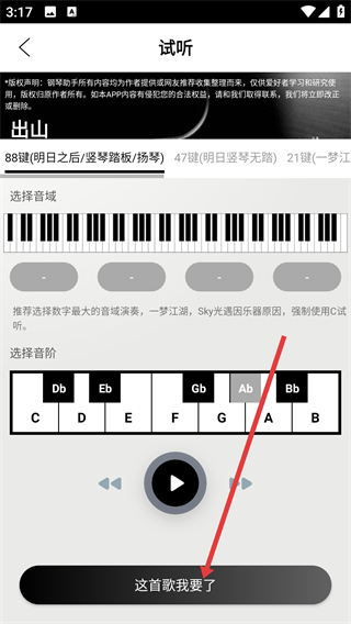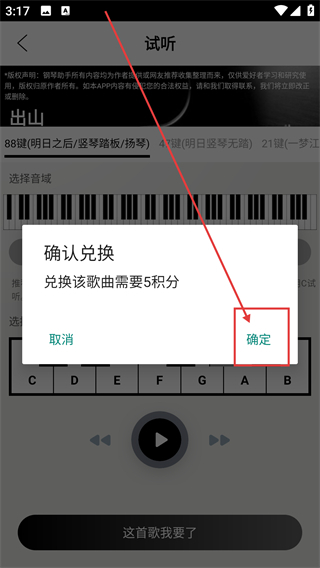 3、在试听页选好音域和音阶后,点底部的【这首歌我要了】按钮,就能触发兑换确认弹窗哦。