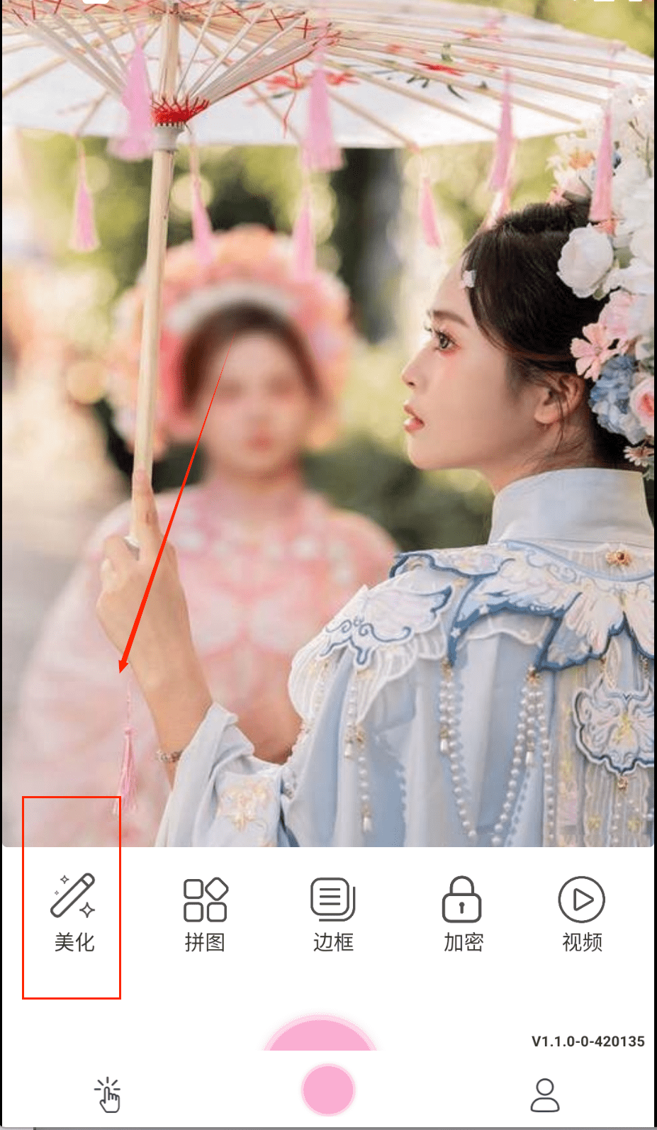 1、选择美化功能调整照片基础参数,滑动亮度、对比度、饱和度等选项,让汉服的颜色和纹理更加鲜明动人。
