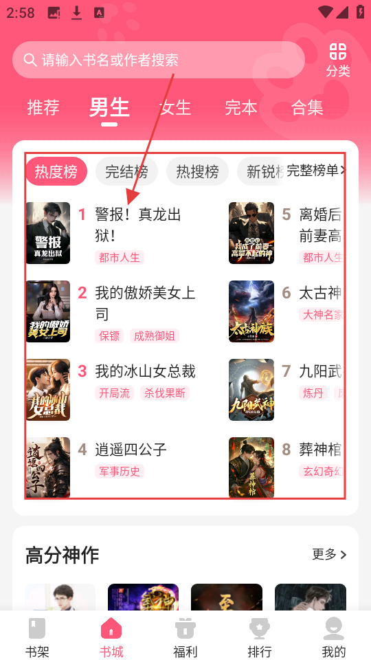 1、在书城男生板块的热度榜里,有众多热门小说,点击感兴趣的小说如【警报!真龙出狱!】,即可进入详情页开始阅读哦。