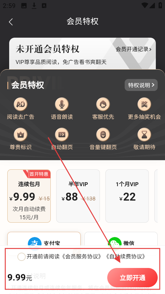 4、若选择开通会员,进入会员特权页面后,点击【立即开通】按钮,就能享受会员离线阅读等权益啦。