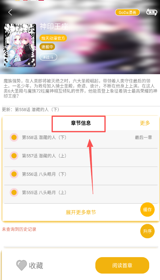 2、进入漫画详情页面后,例如神印王座,可以看到故事简介和最新章节信息。