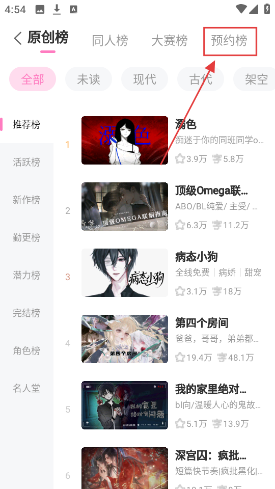 2、进入榜单页面后,我们点击【预约榜】,就可以看到预约类作品的排名情况,找到热门预约作品。