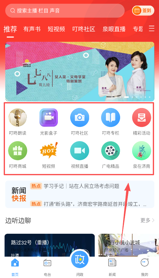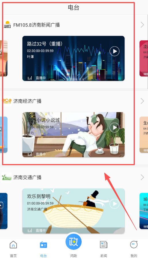 3、收听电台节目很简单,在首页选择电台标签,就能看到像FM105.8济南新闻广播这样的直播频道,方便你选择喜欢的内容。