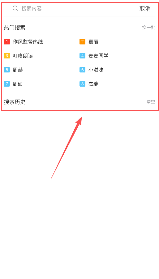 2、想找喜欢的内容,可以点击首页顶部的搜索框,里面会显示热门搜索和历史搜索,搜完还能清空历史记录让界面变清爽。