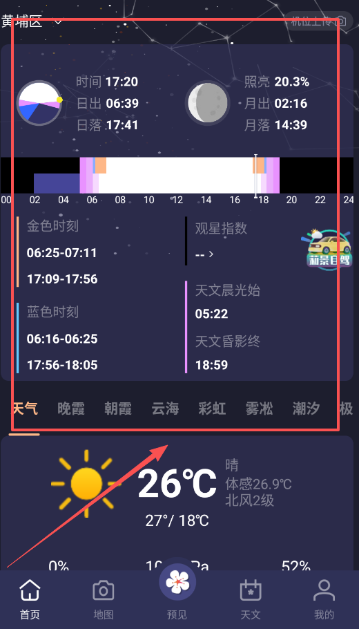 2、在首页或预见页面,你可以查看当天详细的天气、日出日落时间,以及金色时刻和蓝色时刻的具体时段。