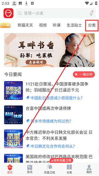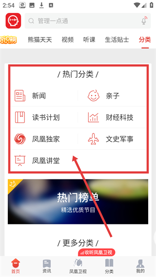 1、在APP首页,点击顶部的【分类】选项,可进入分类页面,查看不同类别的内容栏目啦。