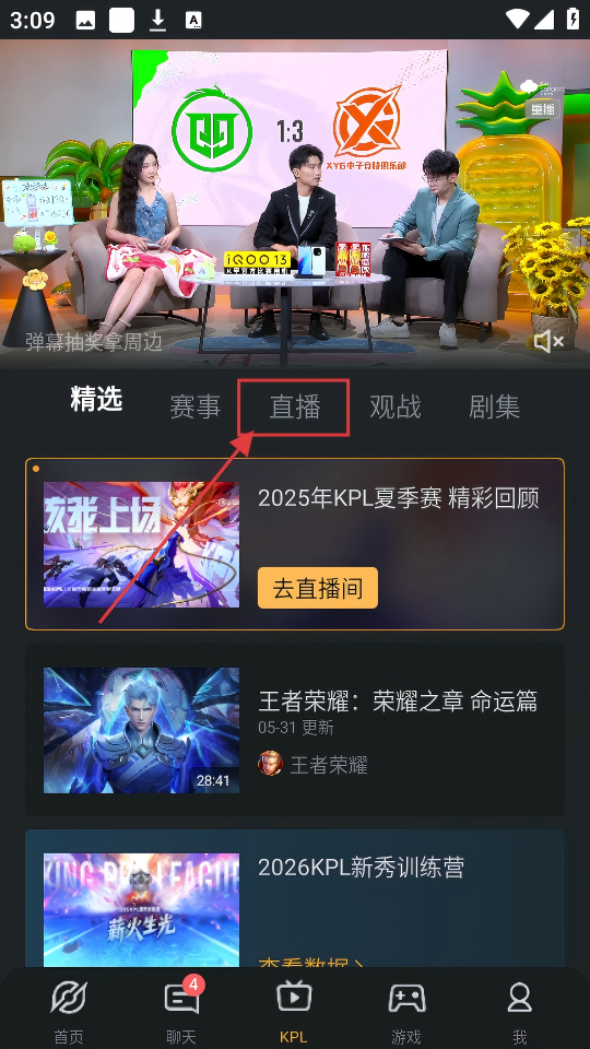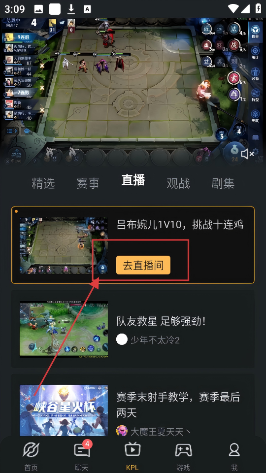 1、在KPL页面,点击【直播】选项,就能看到各类游戏直播啦,很轻松就能找到自己想看的内容呢。