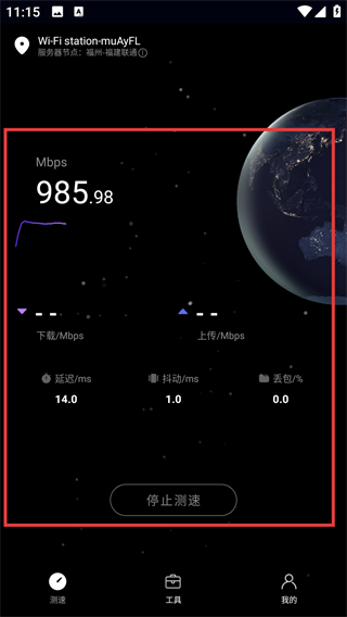 2、测速过程中会显示实时的下载-Mbps数据,还能看到延迟-抖动-丢包等信息,想暂停的话点【停止测速】就行哦。