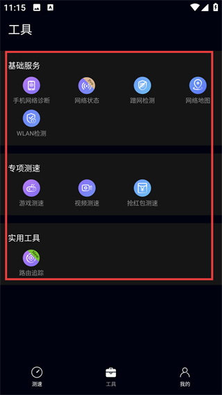 3、切换到【工具】页面,能看到基础服务-专项测速-实用工具等分类,找到需要的功能就能点进去用啦。