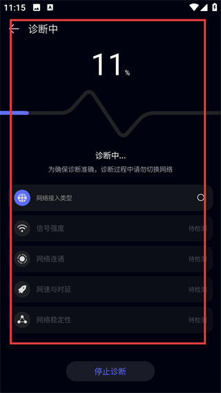 4、进入【手机网络诊断】后会显示诊断进度,过程中别切换网络,等诊断完成就能看到各项网络指标的结果啦。