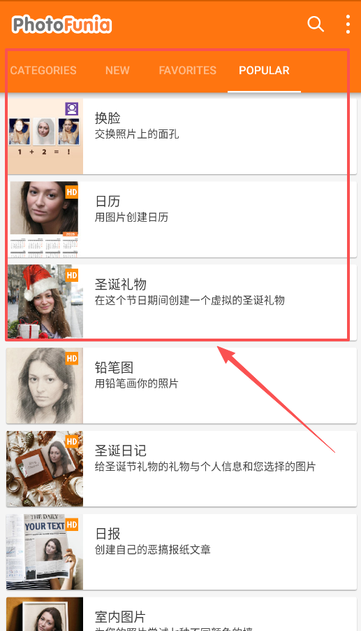 1、使用 PhotoJunio 的攻略在于善用其分类导航,应用启动后,上传你的肖像照,调整大小和位置,保存图片就完成了。