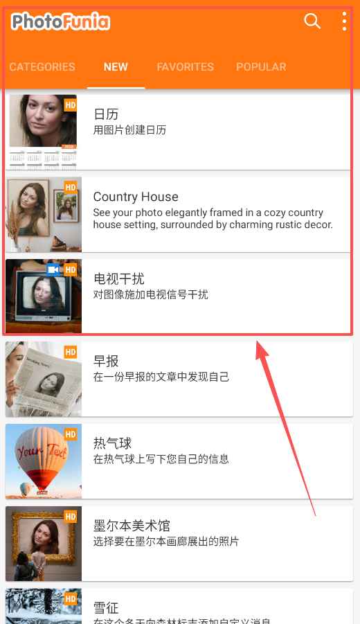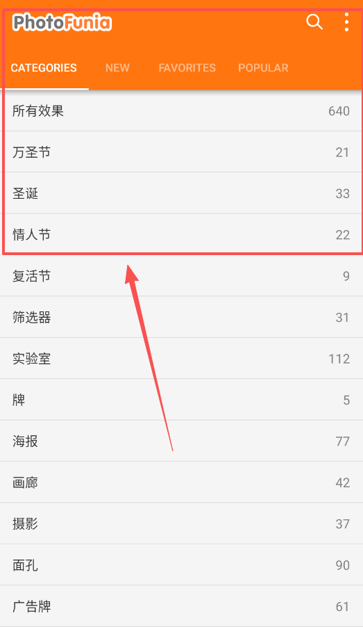 1、对于 PhotoJunio 来说,它的主要特色是明确的效果分类与数量展示,首先会看到顶部的 NEW、FAVORITES 和 POPULAR 分类栏。