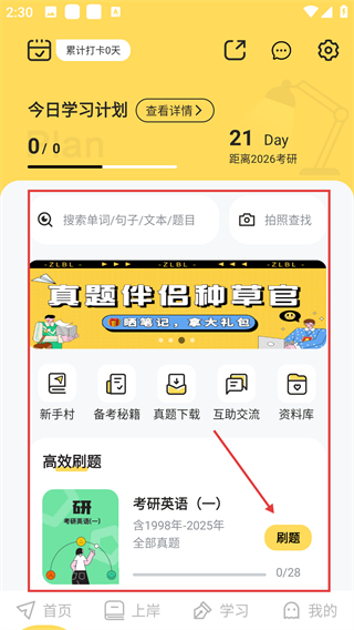 1、在考研学习应用首页,点【考研英语(一)】旁的【刷题】按钮,可进入该科目刷题页面开始练习哦。