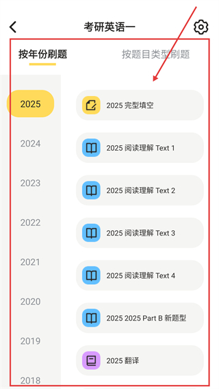 2、进入考研英语一刷题页后,能选【按年份刷题】或【按题目类型刷题】,点对应题型就能开始做题啦。
