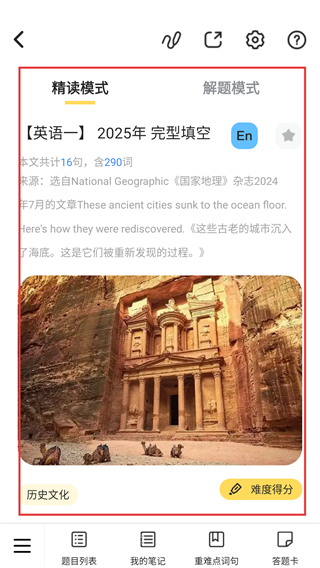 3、进入题型详情页后,可选【精读模式】查看文章背景和内容,辅助理解题目提升学习效率哦。