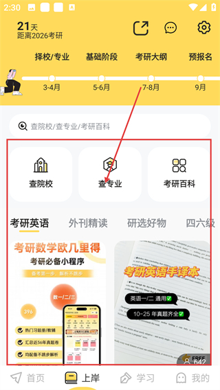4、在“上岸”页面,点【查专业】选项,可查询考研专业相关信息,帮自己规划备考方向呀。