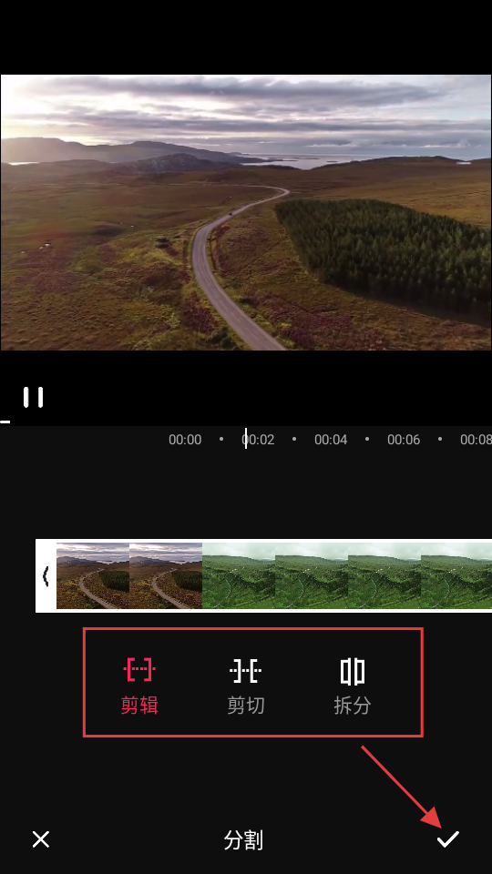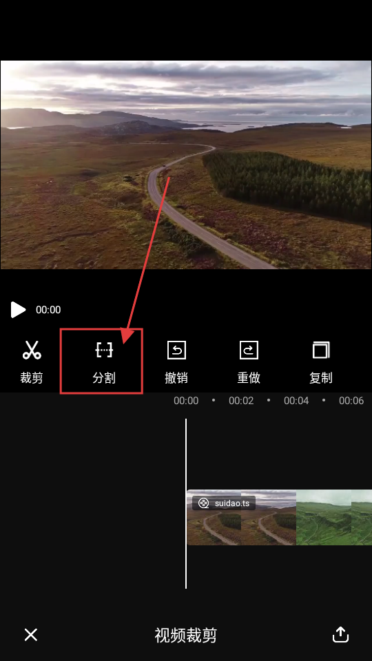 2、在视频剪辑界面,找到【分割】功能按钮并点击,可对视频进行分割操作,划分不同片段哦。