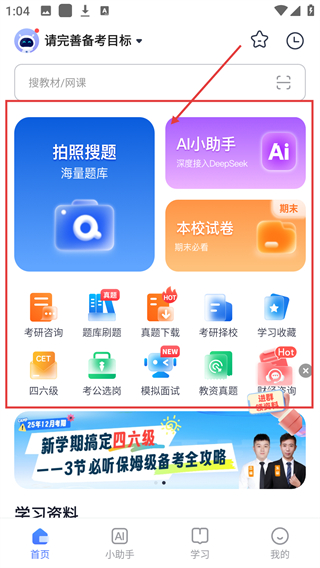 1、在备考应用首页,能看到【拍照搜题】【小助手】等功能,选对应选项可开启对应学习服务哦。