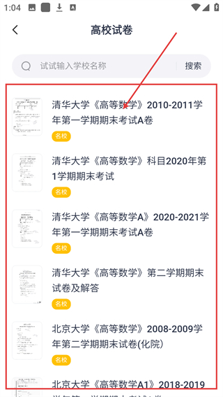 2、进入高校试卷页后,能看到多所名校的学科试卷,选目标试卷就能查看对应考试的题目内容啦。