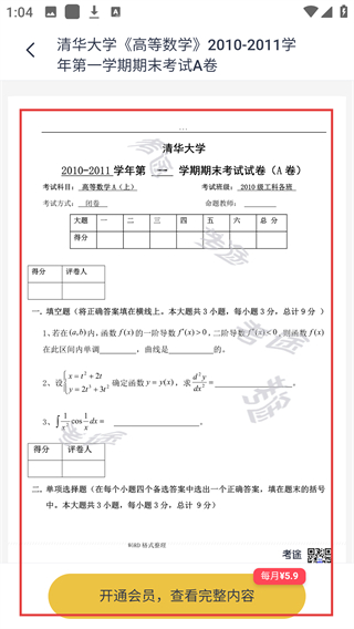 3、打开具体试卷后,可查看试卷的题目内容,若想获取完整内容,可按提示开通会员解锁哦。