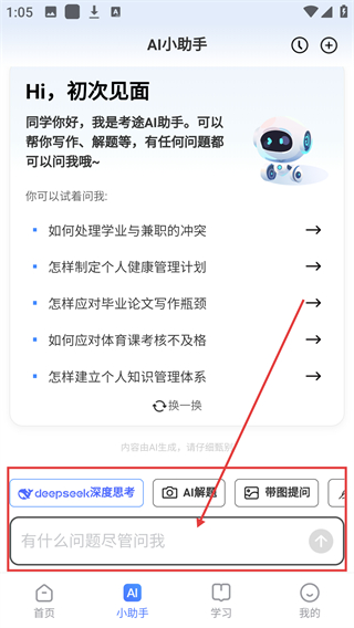 4、在小助手页,可通过输入框提问,也能选预设问题,让助手帮你解决学习相关的疑惑呢。
