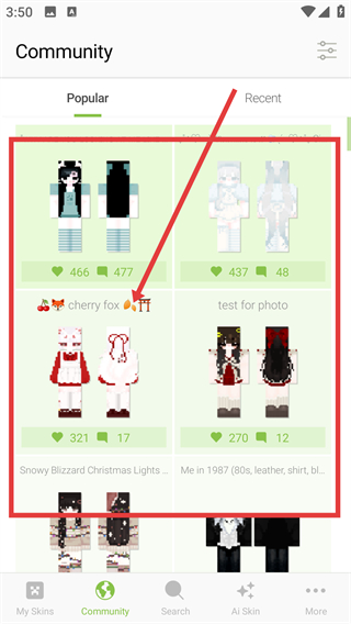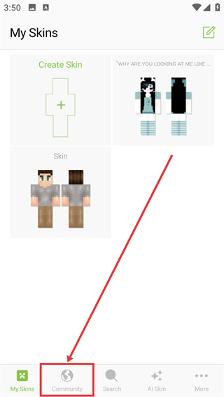 1、在【MySkins】页面点击底部【Community】选项,就能进入社区页面,查看其他玩家分享的皮肤啦。