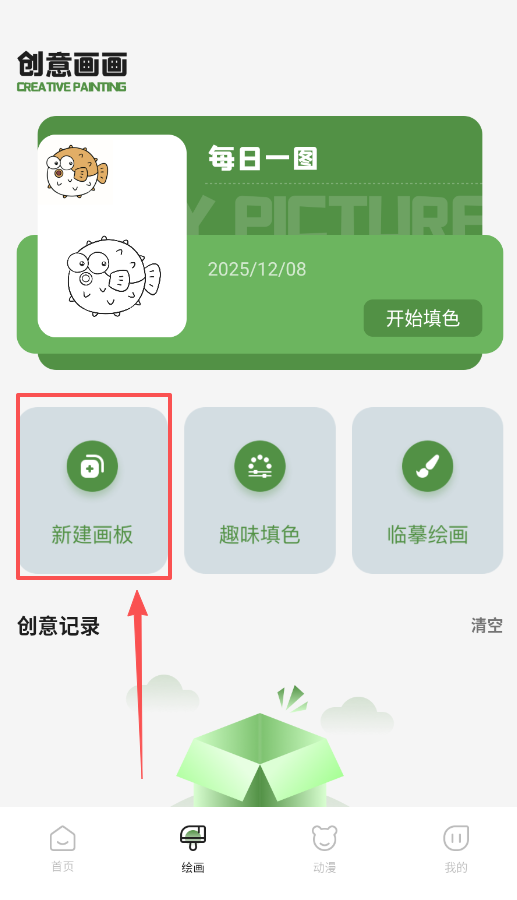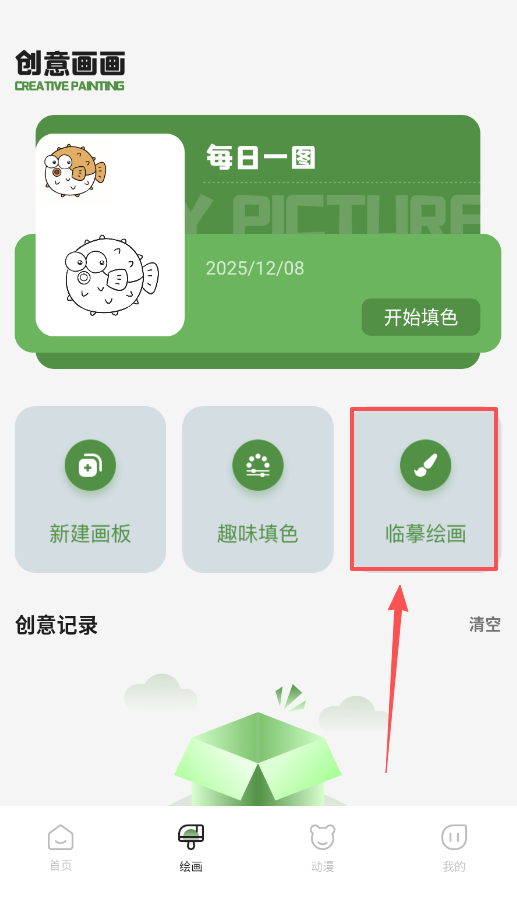 1、先从首页的“趣味填色”或“临摹绘画”开始吧,这能帮你熟悉软件,完成的作品会自动保存,之后可以在“我的绘画”里随时找到它。