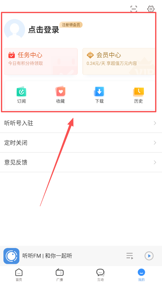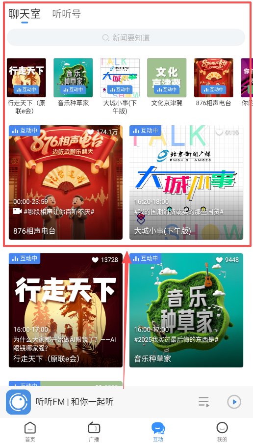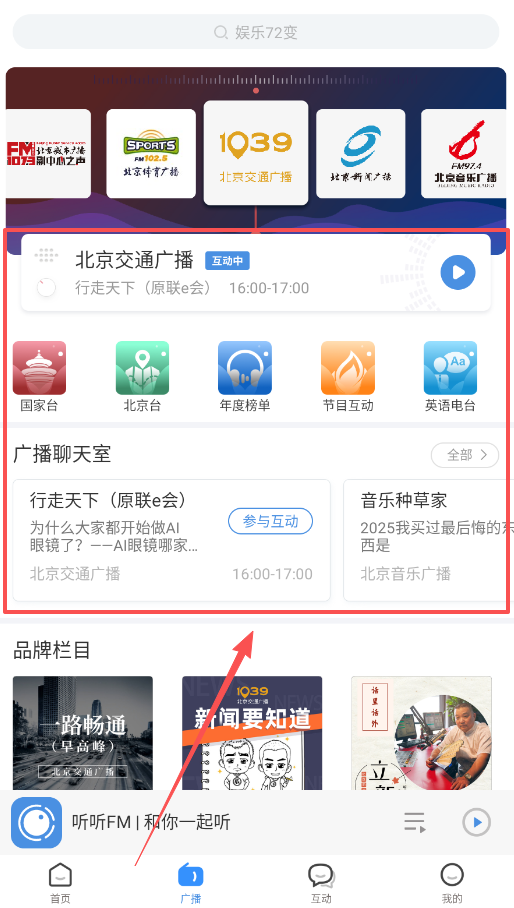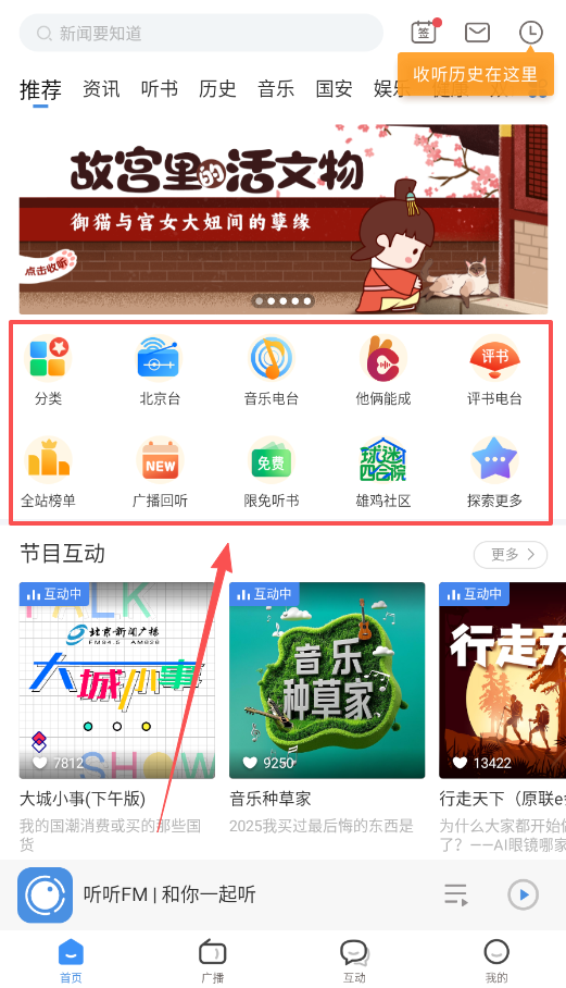 4、如果想回听错过的精彩内容,除了在“我的”里找历史,还可以去“广播”页的“节目互动”区。