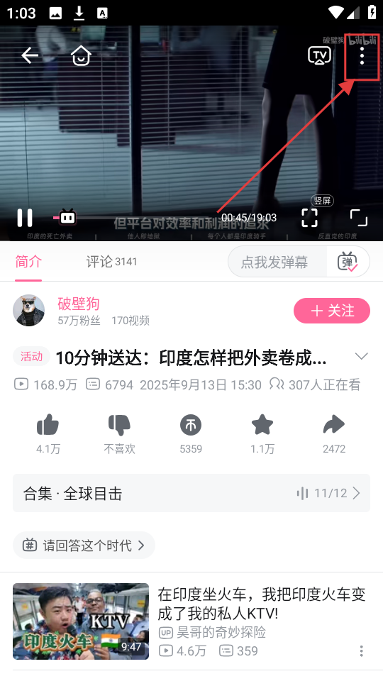 2、进入视频播放页面后,点击右上角三个点的图标,展开更多操作选项哦。